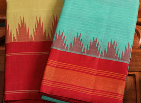 タミル・ナードゥ州の古都タンジャーヴールの近くのティルブヴァナムのサーリーは、ギザギザした大きなテンプルボーダーが特徴だ。天に突き出すように建つ雛段状のゴープラムの形により近い。